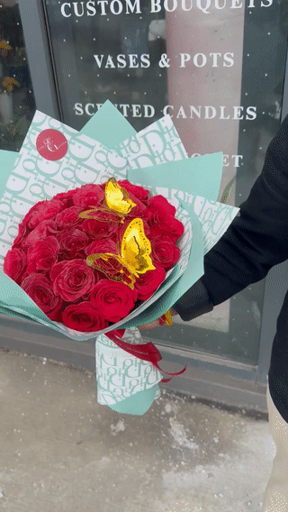 Playful, vibrant, and full of charm. Deep red roses topped with golden butterfly accents, wrapped in a fresh mint green designer-print paper and tied with a red ribbon. A whimsical yet elegant gift that stands out from the ordinary.